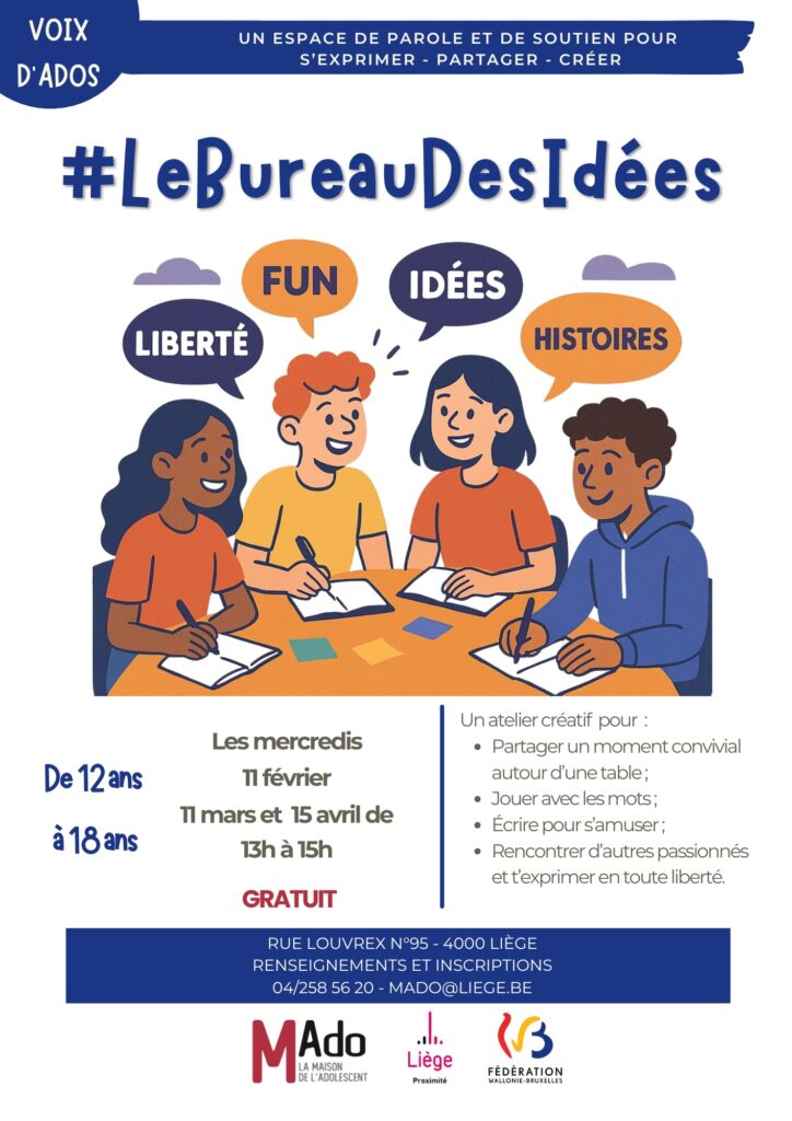 "Jeunesse Ardente" - Projet de consultation et de participation des jeunes liégeois. jeunesse.ardente@liege.be "Service Jeunesse" - Service menant des initiatives spécifiques en faveur de la jeunesse. jeunesse@liege.be "La Maison de l'adolescent (Mado)" - Centre pluridisciplinaire répondant aux besoins des adolescents de 11 à 22 ans. mado@liege.be https://www.facebook.com/MAdoLiege