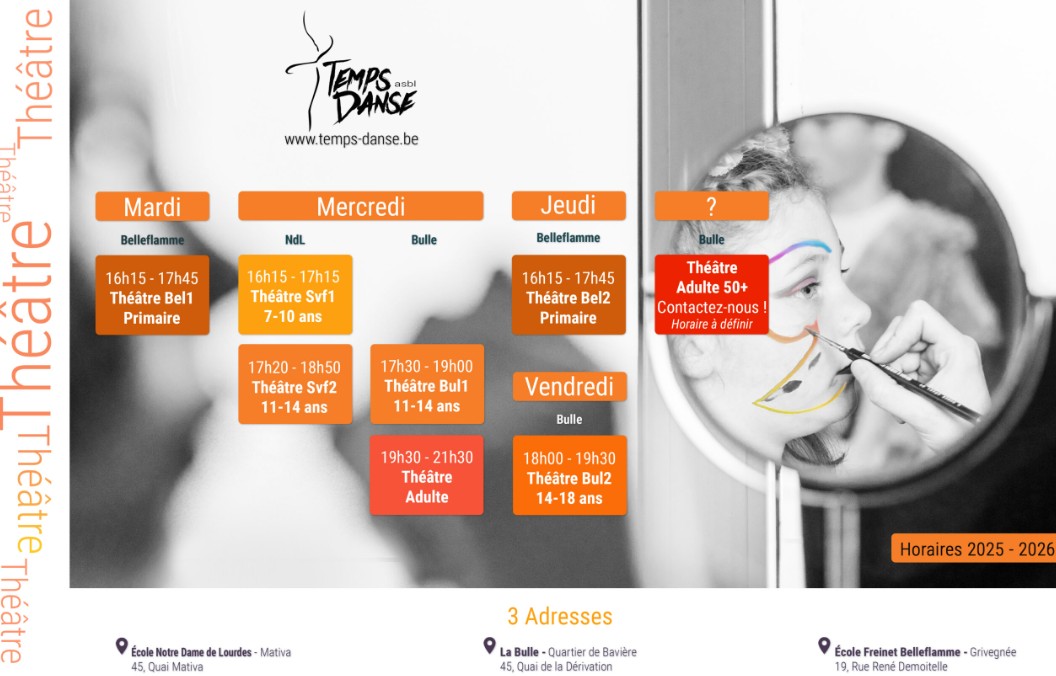 Les spectacles des ateliers de théâtre sont présentés dans un lieu extérieur que nous louons à cette fin. C’est une occasion unique pour les élèves de se retrouver dans un véritable lieu de représentation, avec les coulisses, les lumières, les décors… L’ambiance y est familiale et chaleureuse !