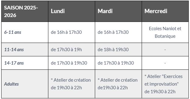 Le TURLg organise pendant l’année scolaire et académique des ateliers de théâtre à l’attention des enfants, des adolescents et des adultes. Ces ateliers ont lieu le lundi, le mardi et le mercredi dans nos salles au sein des bâtiments de l’Université au centre-ville. Informations pratiques: Cliquez ici