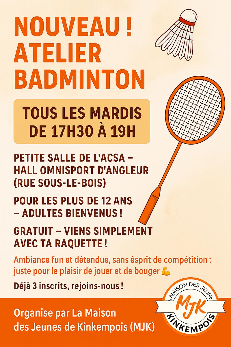Alors rejoins-nous au nouvel atelier BADMINTON organisé par la Maison des Jeunes de Kinkempois !