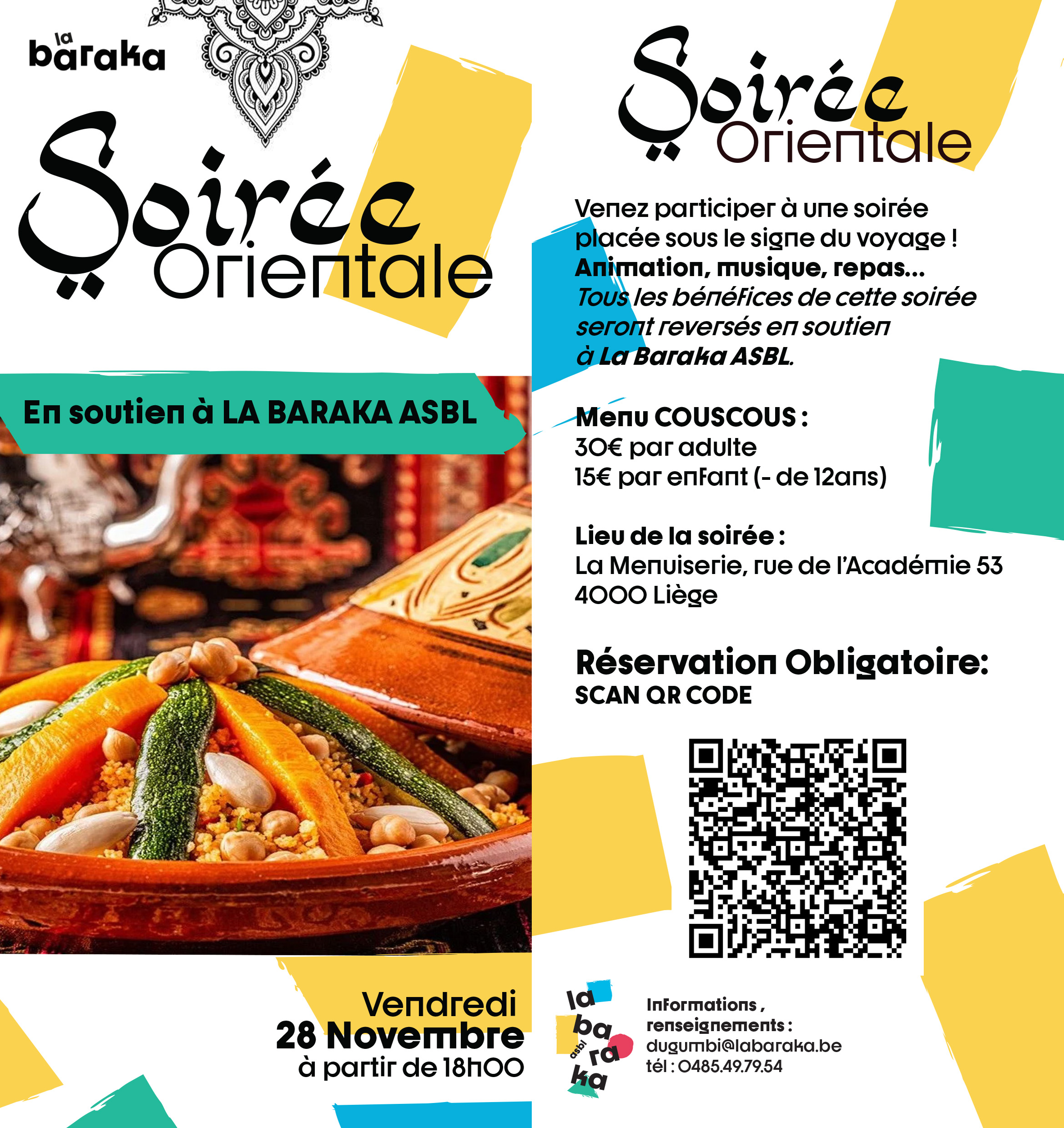 Nous avons le plaisir de vous inviter à une Soirée Orientale exceptionnelle, placée sous le signe du voyage, du partage et de la solidarité, au profit de La Baraka ASBL.