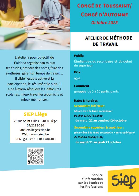 L’atelier a pour objectif de t'aider à organiser au mieux tes études, prendre des notes, faire des synthèses, gérer ton temps de travail… Il cible l’écoute active et la participation, le résumé et le plan. Il aide à mieux résoudre les difficultés scolaires, mieux travailler à domicile et mieux mémoriser.