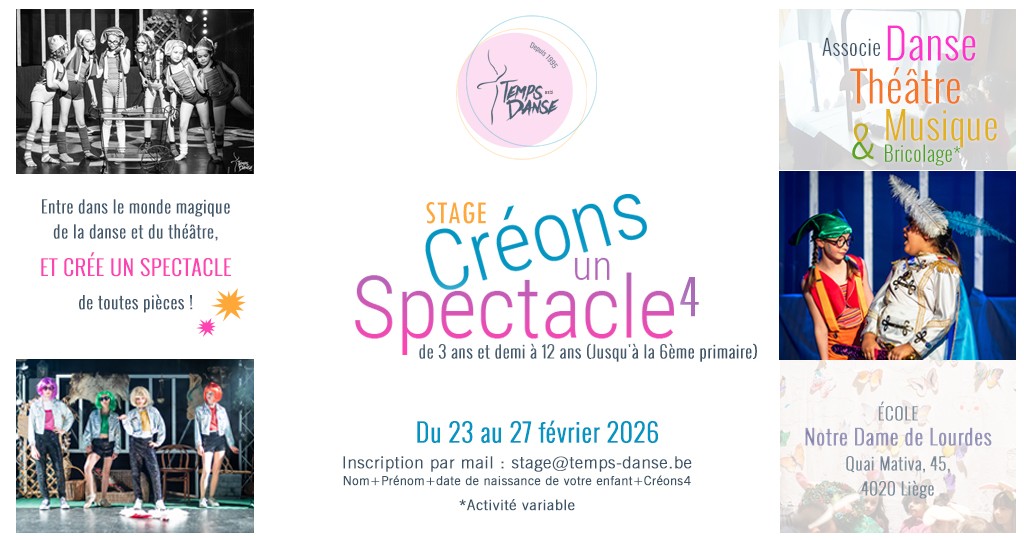 Durant toute une semaine, vos enfants passeront dans plusieurs ateliers de danse et théâtre afin de créer une mini pièce que nous vous présenterons.